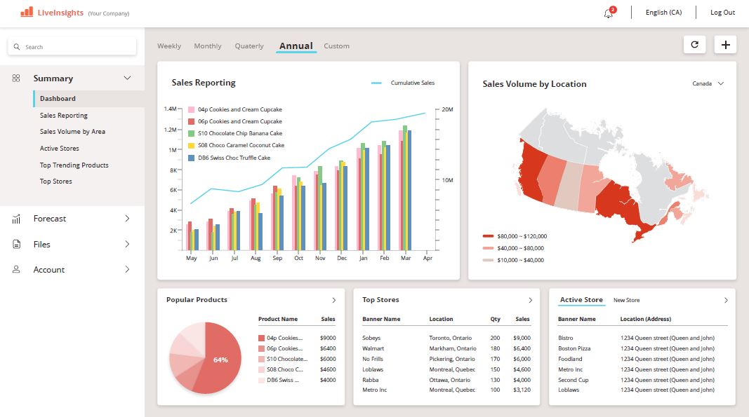 SaSS platform CPG Companies.Provides insights on SKUs sold by banners, regions Provides intelligence on top selling products, fastest growing products and much more. Developed web dashboard using React with interactive charts.